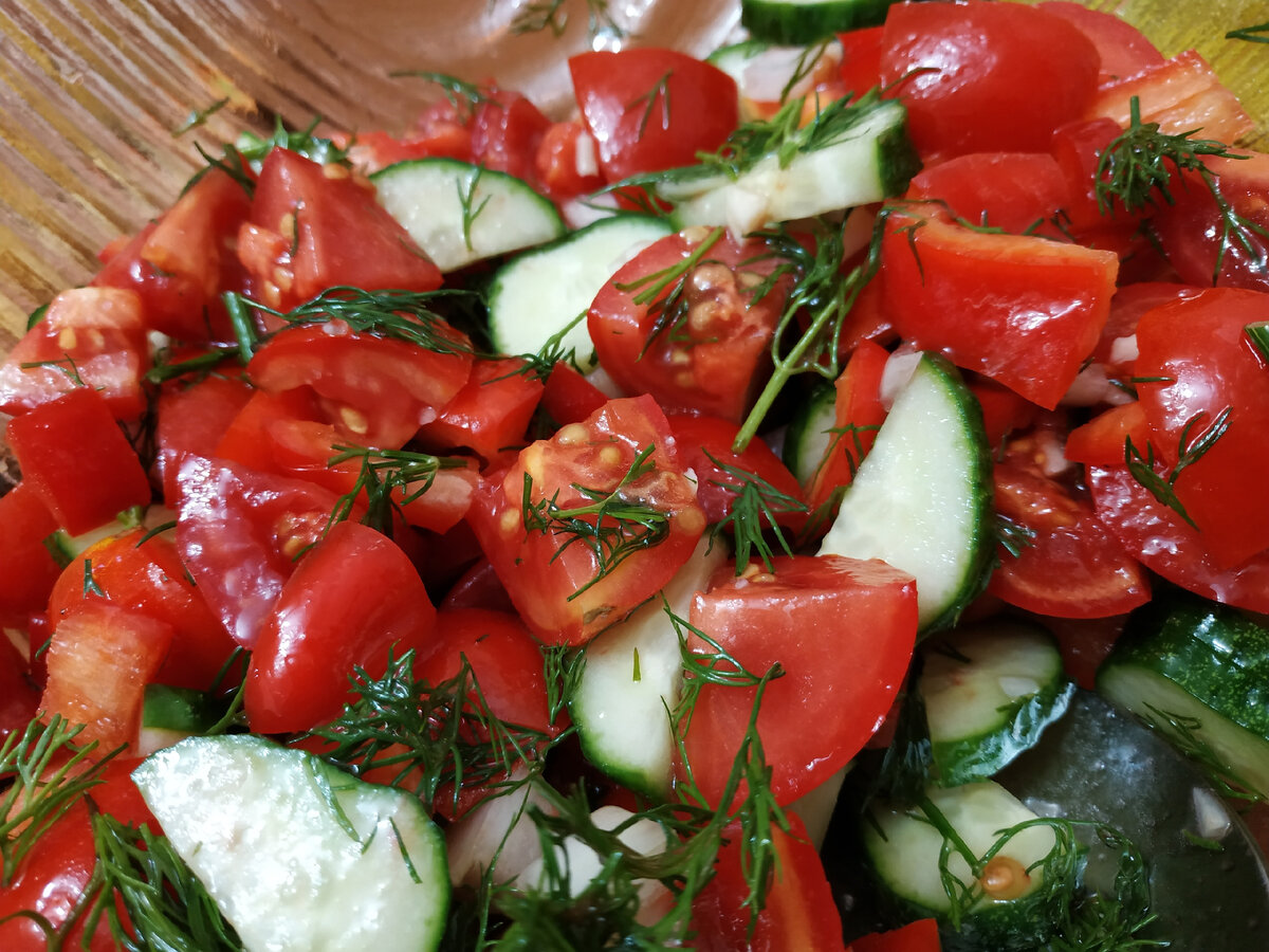 Хотите приготовить всеми любимый салат из помидоров и огурцов. Расскажу Вам свой вариант этого рецепта с секретным ингредиентом. Именно он сделает Ваш салат особенным. Подготавливаем необходимые продукты, полный их перечень Вы найдете в конце рецепта. Приготовление: 1. Помыть и обсушить все овощи. 2. Нарезаем помидоры на средние кусочки. 3. Огурцы я люблю нарезать полукругами. 4. Рубим мелко лук и чеснок. 5. Также средне нарезаем Вашу любимую зелень, у нас это укроп. 6. Очень вкусно получается, если добавить сладкий перчик. 7. Солим и заправляем маслом. Необходимые ингредиенты: 1. Помидоры - 4 шт. 2. Огурцы свежие - 2 шт. 3. Соленый огурчик - 1 шт. - секретный ингредиент! 4. Лук - 0,5 шт. 5. Чеснок - 1 зубец. 6. Перец сладкий - 0,5 шт. 7. Зелень - любая на Ваш выбор - пучок. 8. Соль по вкусу. 9. Масло растительное для заправки.