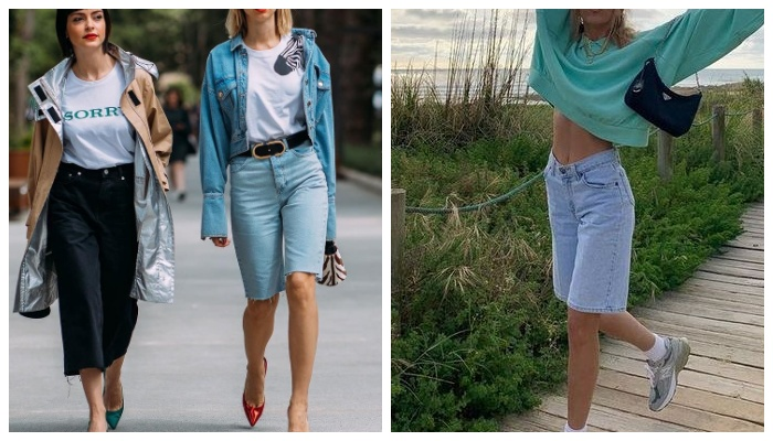 Сегодняшняя подборка летних аутфитов посвящена бермудам из денима. Эту вещь чаще всего модницы не приобретают, так как элементарно не знают с чем ее комбинировать в повседневной жизни, чтобы не выглядеть коротышкой или полненькой. Оставайтесь с нами, следующие образы развеют все ваши тревоги и сомнения. Удлиненный силуэтные шорты — это вызов самой себе, если вы готовы к пристальному вниманию к своей персоне, обязательно примерьте эту модель. Чтобы образ получился в меру женственным и сексуальным, джинсовые бермуды гуру моды дополнили базовой белой футболкой, объемным черным жакетом, а также минималистичными босоножками с тонкими перемычками. Джинсовые бермуды в следующем образе гармонично смотрятся с белым топом, бейсболкой, объемным жакетом, плетеной сумкой из натуральной кожи, высокими светлыми носками и громоздкими кроссовками. Еще один невероятно практичный и комфортный образ получился благодаря сочетанию бермудов с толстовкой оверсайз размера, бейсболкой и кроссовками. Вот вам ещ