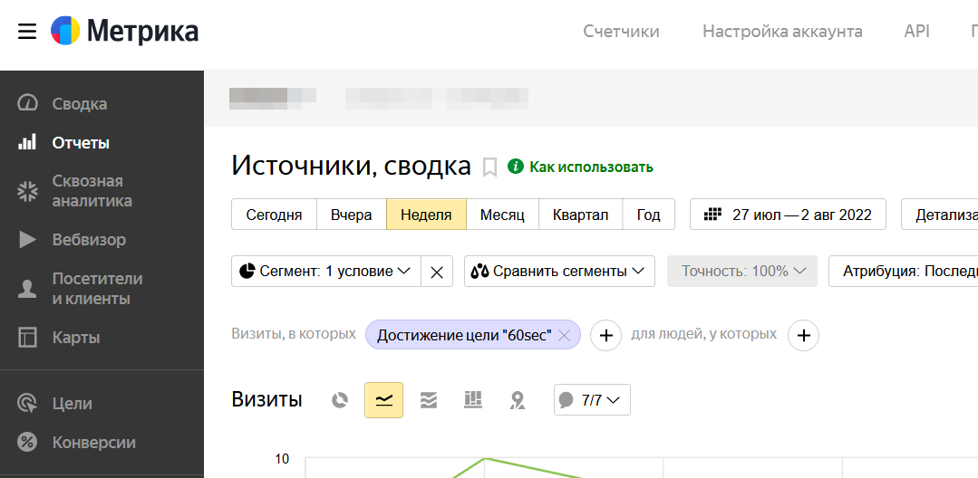 Вставляем тут свой номер счетчика и переходим к настройке метрики. Создаём цель с идентификатором 60sec.