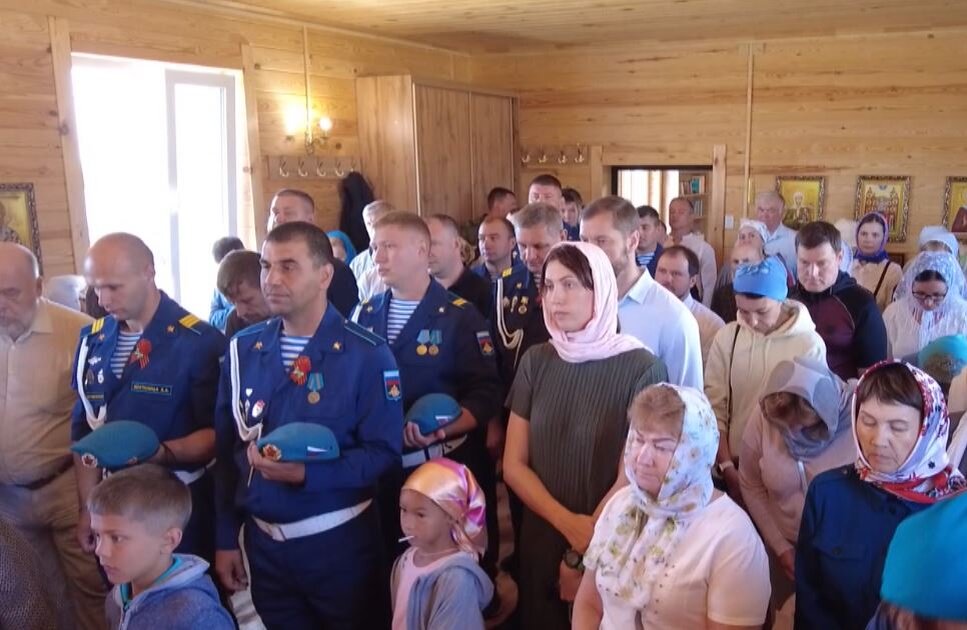 Не в фонтан купаться, а в храм - молиться. С утра пораньше. Вот они - бойцы, стоят в форме, но без голубых беретов. Головной убор в храме мужчинам не положен. Однако без традиционных для дня ВДВ песен не обошлось. "Синеву" исполняют дети священника и прихожан.