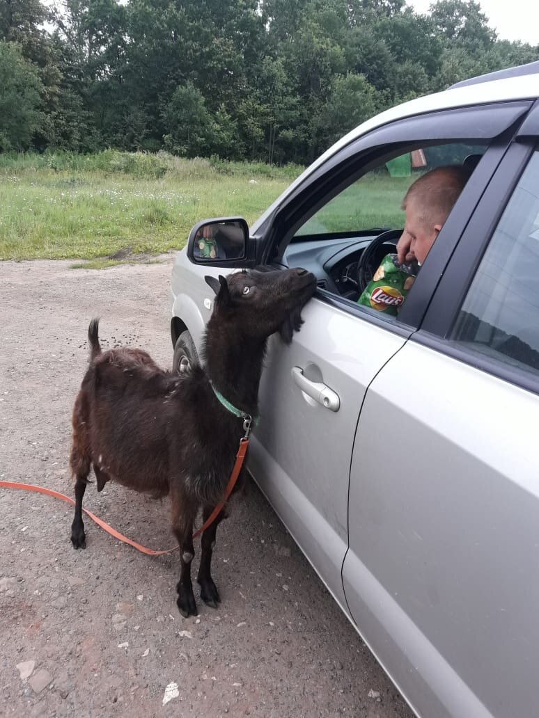 Клякса самая старшая коза и очень упрямая. Так вот, если вдруг ей вздумал ось встать посреди дороги, а там еще и машина едет... Фиг она сойдет с места🤣. Ну может если только за вкусняшки она и подчиняется, но не факт. И такую черту характера мы обнаружили позже, когда у забора стали привязывать ее пастись. Фото старые, случайно нашла, как раз первая весна, когда она у нас.