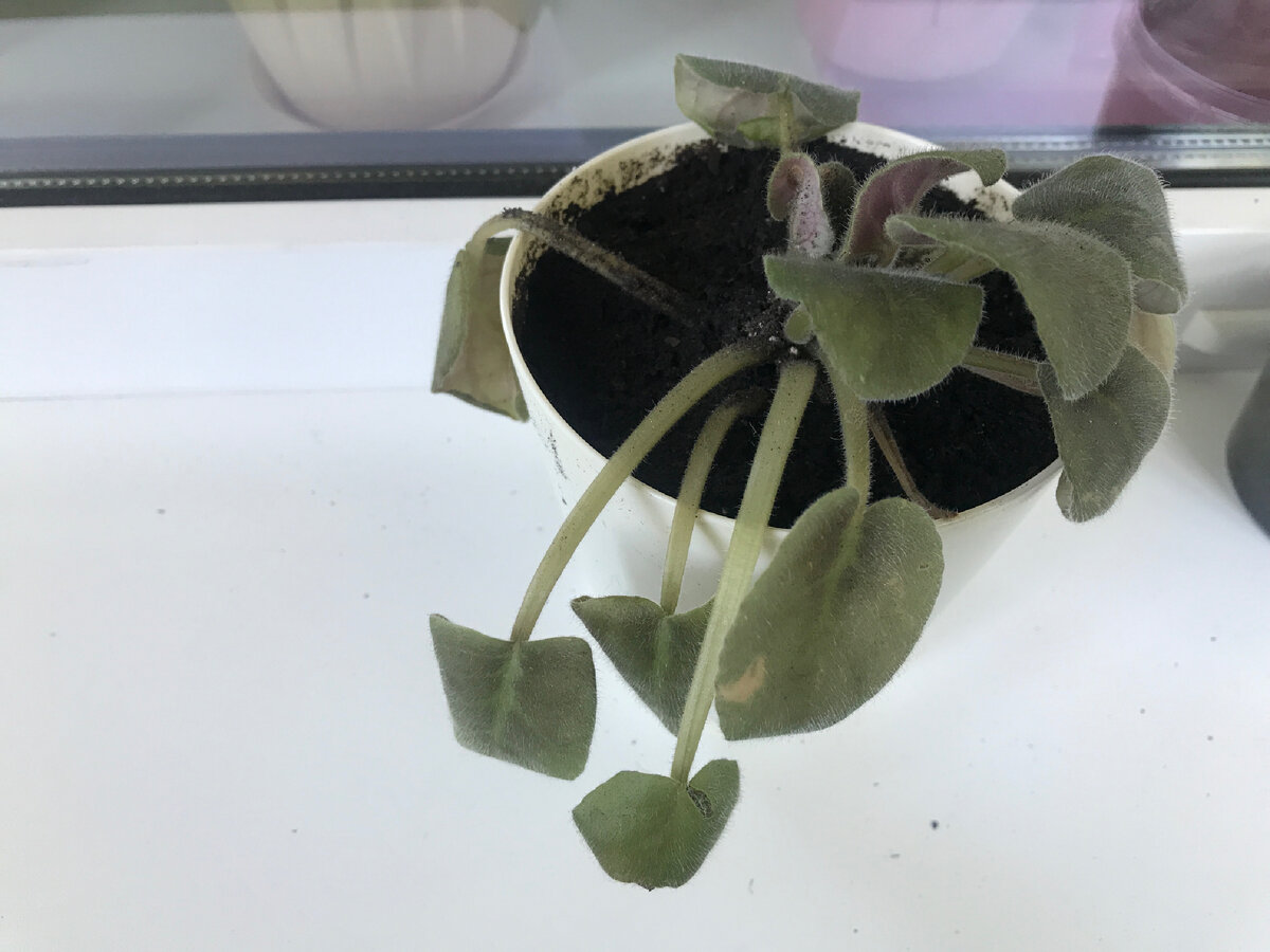 Так выглядела моя бедняжечка на следующий день после пересадки. Прошёл месяц, листочки немного поднялись, но ещё есть, куда расти.