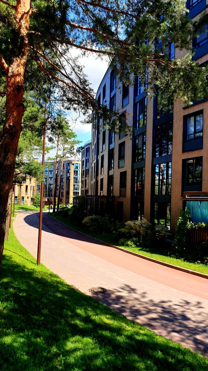 Яндекс.Недвижимость обозначает про это место так: «Квартал «Мир внутри» расположен в многолетнем хвойном лесу на первой береговой линии Финского залива в самом сердце Курортного района Санкт‐Петербурга». Это современный жилой комплекс, состоящий из 10 жилых домов, окруженный сосновым лесом. От окна квартиры, которую мы снимаем, до выхода к морю – началу пляжа – 20 метров. Территория огорожена, видеонаблюдение, безопасное место. Много разных детских и спортивных площадок. Современный дизайн всего комплекса вписывается в ландшафт, продумано все до мелочей. На территории кофейня с ценами существенно ниже, чем в Обнинске, но при этом качество кофе и десертов отличное, магазин здоровой еды, семейный центр: детские занятия, танцы, спортзал. Также есть ресторан веганской еды. Очень вкусно и ценник не космос. Дети даже не поняли подмену, так классно приготовлено. Вся территория жилого комплекса создана для здорового образа жизни, поэтому уже с 6 утра из окна я вижу людей на пробежке вдоль