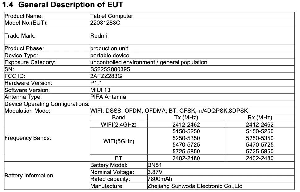 Похоже, что китайская компания Xiaomi готовит ещё один планшет, причём это будет недорогая модель. Судя по всему, новинка будет называться Redmi Pad 6, а не Xiaomi Pad 6, и она скоро может выйти. В базе данных FCC появились сведения о планшете с модельным номером 22081283G. По данным источника, этот планшет получит батарею ёмкостью в 7800 мА·ч с зарядкой мощностью в 67 Вт, поддержку 5G и Wi-Fi 802.11ac. Также известно, что новинка может получить MIUI 13 или MIUI 13 Lite. А вот данных о процессоре, объёме оперативной и постоянной памяти и диагонали экрана пока что нет. Но сам факт появления планшета в базе данных регулятора говорит о скором выпуске. Ранее сообщалось о планшетах Xiaomi Pad 6, с экраном диагональю 12,4 дюйма и Redmi Pad 5G с 10,4-дюймовым дисплеем.