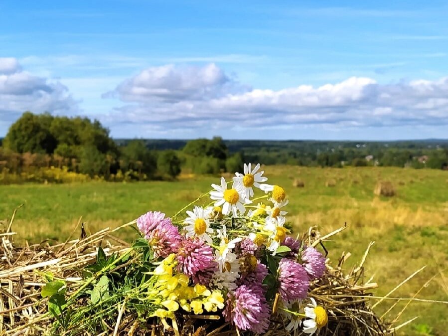 В круглые копны закатан июль, флороконсервы. В копнах сено грубое, как солома, попробовала - не понравилось, смягчила букетиком. За околицей Костромы просторы неизмеримые, красота и свобода в шаговой доступности. На ближайших полях царит клевер. И ромашечек немного. Повалялась в росе - свежо и сладко! Подружилась с заслуженным ботинком, он рассказал о художественной выставке на берëзах. Побежала, поймала в объектив, смотрите Картинная галерея за околицей Костромы, в пространстве, где среди старых берëз растут юные коттеджи. Неожиданно, восхитительно, раздумчиво. Мотивирует на новые поиски визуальных приключений. Вам случалось оформлять подобным образом общественные, открытые пространства? Этому прогулочному фоторепортажу ровно год, оригинальная публикация здесь: https://vk.com/wall4855447_21766 А в снегах полгода спустя галерея выглядела так: Нужно добежать, посмотреть, как там нынче, да? Россия радует разнообразием, Золотое кольцо не замкнуто рамками городов, здорово шагну