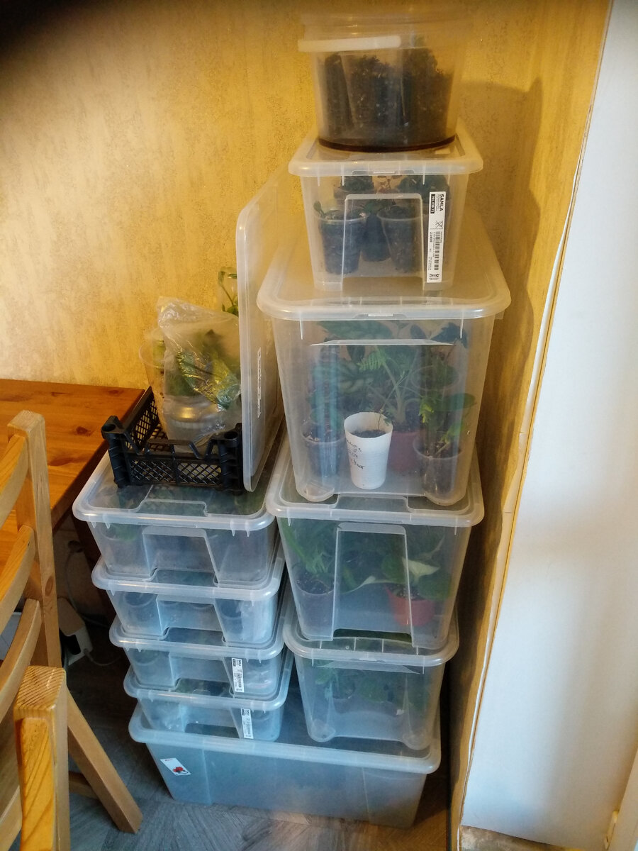 Популярный вопрос про отпуски-отъезды - почему бы не попросить полить родственников/соседей/друзей или почему не отнести к ним же. Вообще оба вопроса связаны. Начну с отнести. У меня - вот: Тут упакованы не все. Еще есть немного терпеливых, оставленных на стеллажах на окне. Есть орхидеи. Когда мы уезжали в марте, я все же относила соседке два небольших контейнера с сеянцами. (Повезло, что она в теме по растениям!) Это было то, что вряд ли выжило без полива. Тут немало однолетников, которые к лету уже оказались в открытом грунте. Хотя сейчас я думаю, что в закрытых "тепличках" и им бы ничего не было. Летом я не относила ничего. Про попросить полить. К концу лета мелких сеянцев, как в весенний отъезд, практически не осталось. Не сеяла как раз по причине частых отъездов летом. Но те же фиалки выглядят вот так То есть чтоб приходящий человек полил, он должен: 1. Или быть весьма в теме, чтоб дозировать количество воды на глаз и быстро пройтись по всем стаканчиками. Или следовать неко