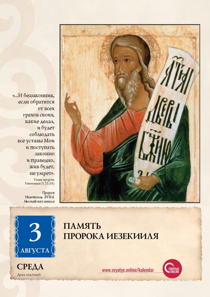 Пророк Иезекииль родился в городе Сарире, был священником и сыном священника. Во второе нашествие на Иерусалим царя Навуходоносора, в 25-летнем возрасте отведен в Вавилон. В плену жил при реке Ховар, где в 30 лет ему было открыто будущее еврейского народа и всего человечества. Пророк увидел сияющее облако, в середине которого находился пламень, а в нем – таинственное подобие движимой духом колесницы и четырех крылатых животных, имевших каждое четыре лица: человека, льва, тельца и орла. Перед их лицами находились колеса, усеянные очами. Над колесницей возвышался как бы кристальный свод, а над ним – подобие престола из сверкающего сапфира, на этом престоле сияющее «подобие Человека», а вокруг Него радуга. По толкованию отцов Церкви, пресветлое «подобие Человека» было прообразом воплощения Сына Божия от Пресвятой Девы Марии, явившейся Престолом Божиим; четыре животных символизировали четырех евангелистов, колеса со множеством очей – части света со всеми народами земли. Пророк возвестил н