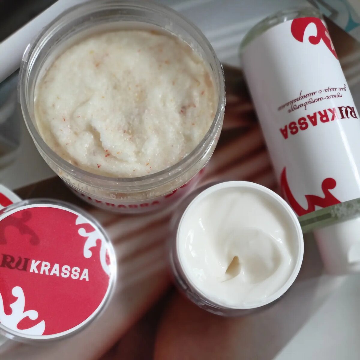 Привет!😍 Я сегодня с чудесным постом. Хочу поделиться своей радостью. Я познакомилась с замечательным брендом и называется он❤️🔥 RUKRASSA. ❤️🔥Я ещё тот скрабеман🤣👏поэтому начну пожалуй с очищения тела. Скраб с цветками Софлоры. ☀️Скраб очень приятный на ощупь. ☀️Скрабирующие частички мелкие. Не травмируют кожу. ☀️ Аромат бомба💥👌 очень приятный. В составе эфирное масло Франжипани обладает антиоксидантными свойствами,возвращает коже эластичность и сияние. 🌷 Для любительниц мягкого отшелушивания рекомендую обязательно обратить внимание на этот скраб. ❤️🔥Тоник-активатор для лица с минералами. Я очень люблю тонизирование. Тоник-активатор содержит в себе особый источник биоэнергии,позволяющий эффективно запускать процессы возобновления выработки коллагена и эластина в коже. ☀️Удобный объем и дозатор. ☀️Прозрачная жидкость не имеет отдушки. ☀️Отлично тонизирует после очищения. ☀️Лицо сразу увлажненное и сияющее. ❤️🔥Крем для лица сапфировое сияние с ним у нас отдельная