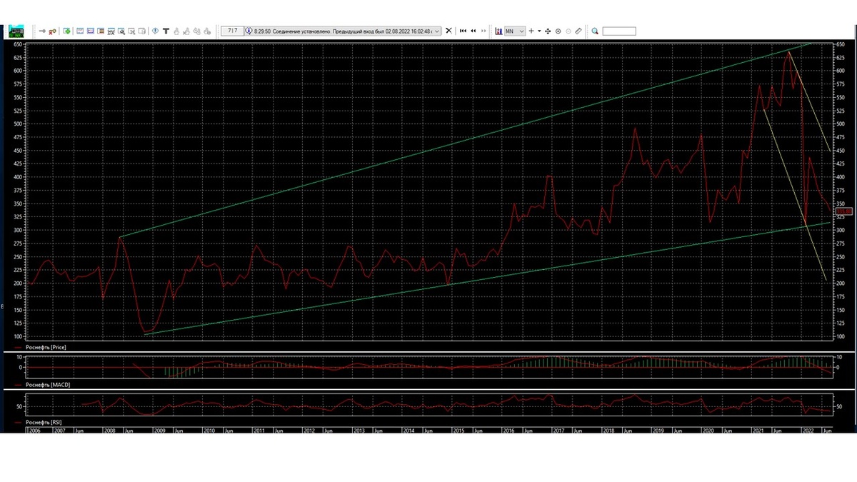 Первый решающий момент прошел госпожа Пелоси в лице Ватикана-Англии-США показала всему миру свою решительность и указала Китаю свое место в мировой системе. Осталось в августе несколько мероприятий, чтобы окончательно понять будем делать технический рост до нового года или с 15 сентября снова пойдем вниз. В данный момент нас интересует акция Роснефть, с помощью технического анализа разберемся, какое движение будет до 15 сентября. Месячный график показывает акция Роснефти пытается дойти до линии поддержки в коридоре 290-490. Индикатор RSI показывает плавный переход в боковое движение, но еще находится в зоне неуверенной покупки и продажи. Индикатор MACD показывает, медленная линия уперлась в нулевой уровень и смотрит вниз. Быстрая линия под углом 90 градусов пересекла медленную линию вниз и нулевой уровень и далеко вниз ушла от медленной линии. Это говорит настроя пока на разворот нет, акция Роснефти пока настроена идти вниз, медведи чувствуют силу свою. Недельный график показывает по