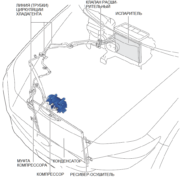 Система кондиционирования воздуха Mazda CX-30 (DM) является основой системы климат-контроля, включающей в себя помимо кондиционера подсистемы обогрева и вентиляции салона. Систему кондиционирования составляют элементы, представленные рисунком ниже. Система кондиционирования охлаждает испаритель с помощью цикла циркуляции хладагента для охлаждения и осушения проходящего через него воздуха. Это происходит за счет изменения давления и температуры заправленного в систему хладагента, в которой он сжимается компрессором, сжижается в конденсаторе, расширяется в расширительном клапане и, распыляясь в испарителе, испаряется и охлаждает его ламели. Вентилятор, пропуская воздух через холодный испаритель, осушает и охлаждает воздух в салоне автомобиля. 1. Когда на электромагнитную катушку статора не подается напряжение (реле кондиционера выключено) (1), нажимной диск, жестко связанный с валом компрессора и шкив компрессора кондиционера разъединены. 2. При подаче питания на обмотку катушки статора