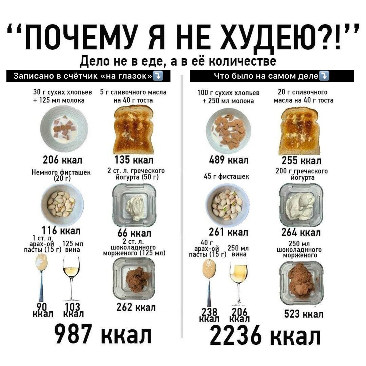 Доброе утро!🌞 МОЖНО ЛИ ВЕРИТЬ КЛИЕНТУ, ИЛИ ВСЯ ПРАВДА О ПОДСЧЕТЕ КАЛОРИЙ. ⠀ Есть исследование, в котором сравнивают насколько правдиво худеющие профи (спортсмены, диетологи) и простые худеющие записывают съеденные за день калории. Интересно, что и те, и другие уменьшают данные. Получается, что даже профессионалы могут ошибаться в подсчёте☝ ⠀ Также и с активностью — 60% худеющих преувеличивают свои энергозатраты. Похоже, что стояние у плиты и уговаривание ребёнка съесть, наконец, свой суп, или дотошный начальник и нудный коллега выматывают, как марафон в десятки километров. И ты уже неосознанно плюсуешь свои якобы сожжённые за день калории. ⠀ Есть, конечно, и такие, кто приукрашивает свои успехи в похудении сознательно. Может, стыдно признаться, что уже «не замотивирован», может, семья не верит в успех и не поддерживает. У каждого свой вариант. Но всё же важно оставаться честным с собой и с тренером, только в этом случае в зеркале отразится, наконец, ваше тело мечты. ⠀ Хорошо, с созн