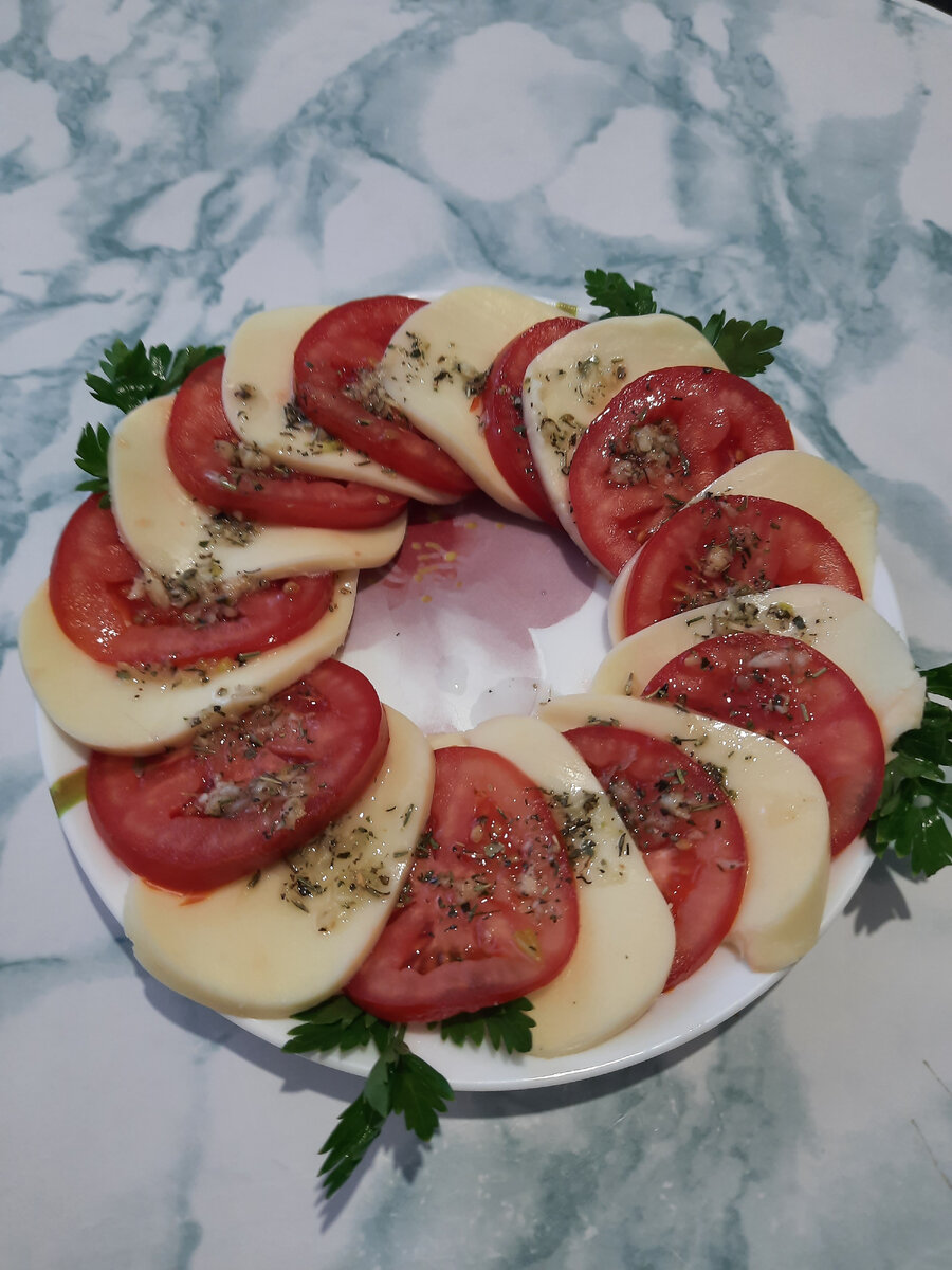 Нам понадобится моцарелла, базилик, чеснок и оливковое масло ( у меня растительное). Моцареллу и помидоры необходимо нарезать кружочками и положить на тарелку чередуя между собой. Для соуса песто смешать оливковое масло 2-3 ст. ложки, чеснок 1-2 зубчика, базилик сушеный 1 ч. ложка, щепотка соли, кедровые орешки по вкусу и полить наш салат. Приятного аппетита!