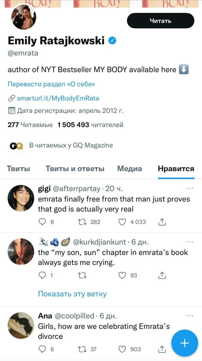Официальных заявлений модель не делала, но дала понять настоящую причину развода. Еще больше новостей в нашем Telegram-канале, группе ВКонтакте и канале Яндекс.Дзен ______________________________ Эмили Ратажковски косвенно подтвердила развод с мужем. 31-летняя американская модель лишь расставила лайки на публикации пользователей, в которых те радовались, что она ушла от изменщика. ЭмРата наконец-то свободна от этого мужчины, это наконец-то доказывает, что Бог есть.Девочки, празднует развод Эмили, – только некоторые из постов, понравившихся модели. Напомним, что инсайдеры, близкие к паре, называли в разговоре с таблоидами ту же самую причину – Бир-Макклард регулярно обманывал Ратажковски. Так что все сходится. Да, он обманывал. Он неисправимый обманщик. Это отвратительно. Он - собака. Ратажковски спровоцировала слухи о расставании в середине июля, когда ее впервые видели без обручального кольца на прогулке с годовалым сыном Сильвестром. А в июне она не поздравила супруга с Днем отца, чт