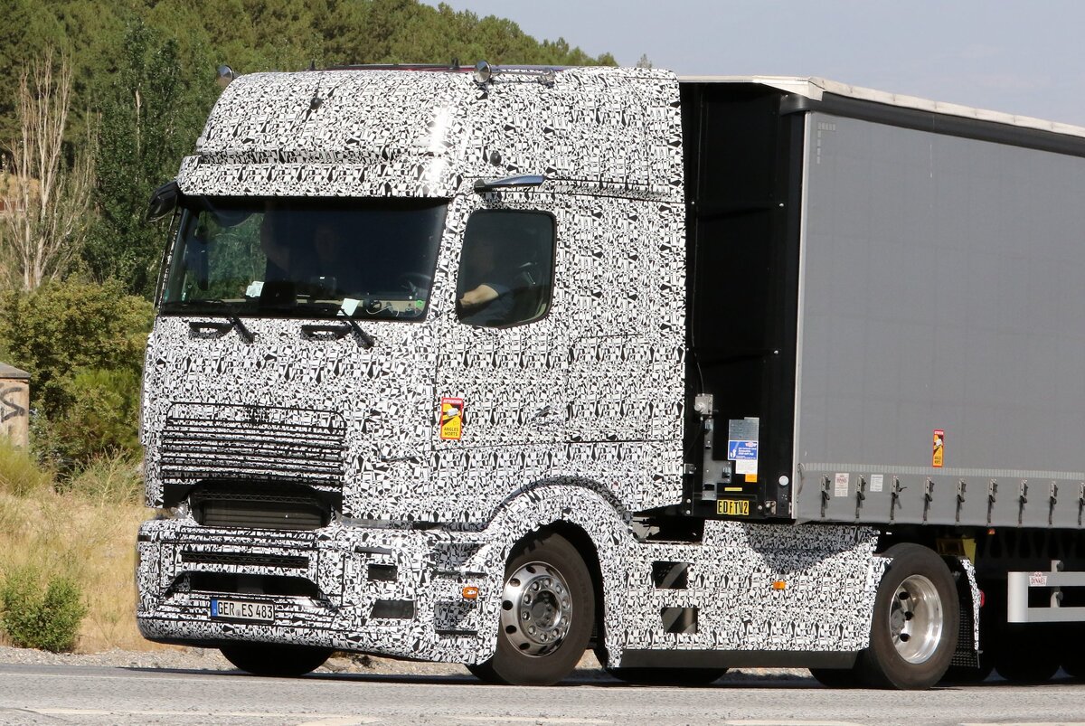 В европейской автоиндустрии готовится интересная премьера. Mercedes-Benz, по-видимому, скоро выпустит свой флагманский Actros с новой кабиной. Как все уже привыкли и знают, автопроизводители поэтапно внедряют все свои новинки. Начинают, как правило, с привода и оборудования, а завершают работу коррекцией кабины. Немцы идут таким же проверенным методом. Недавно они представили новое усовершенствованное поколение двигателей и трансмиссий, а теперь, как видим на фото, активно испытывают новую кабину. Эти фото закамуфлированного Mercedes_а в начале прошлой недели опубликовал норвежский портал Tungt.no. Испытания грузовика сейчас проходят в Испании при довольно высоких температурах. И на этом конкретика заканчивается, оставляя место для многочисленных спекуляций. Здесь самое время вспомнить про сентябрь 2020 года, когда начали действовать новые правила ЕС в отношении габаритных размеров грузовых автомобилей. Согласно этим нормам, кабина может быть удлинена до 90 см, при условии улучшения аэ