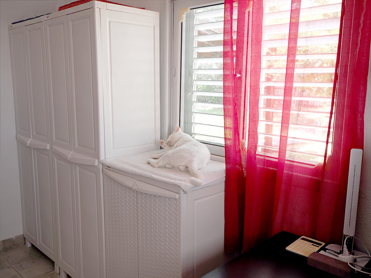 Новое место принял почти сразу. Какое-то время изображал царя горы, скача по коробкам. Валялся в каждом углу. Но любимым местом обитания выбрал мой кабинет.