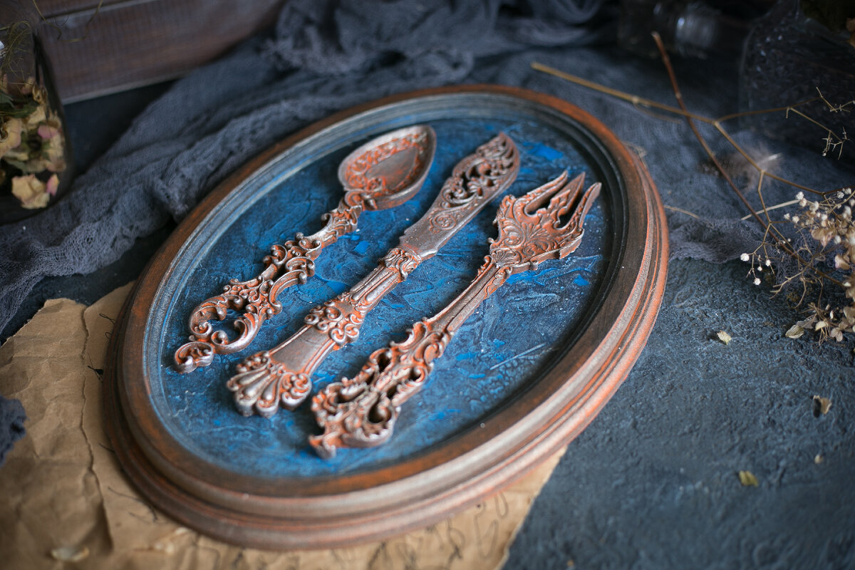 Всем привет! Давайте сегодня вместе задекорируем классное панно. Для работы нам понадобятся: Наношу на основание панно шпатлевку по дереву с помощью мастихина, формируя фантазийный рельеф. Не делайте слишком высокий и неровный рельеф, чтобы столовые приборы хорошо держались. Оставляю сохнуть. Приборы тем временем окрашиваю в коричневый цвет на один или, если понадобится, на два слоя. После высыхания шпатлевки немного ошкуриваю её наждачкой, чтобы убрать острые края. После этого, протираем от пыли и приклеиваем рамку с помощью клея Момент Монтаж. Когда клей высох, приступаем к окрашиванию. Возьмите три сухие кисти и приготовьте синюю и черную краску. Работать нужно будет быстро. Сначала в центр наносим синюю краску одной кистью, слой краски достаточно жирный, чтобы она не успела высохнуть до растушевки. Далее края закрашиваем черной краской с помощью другой кисти. А теперь третьей кистью легкими движениями соединяем эти два слоя. Кисть сухая и чистая, водим ей по месту соединения цветов