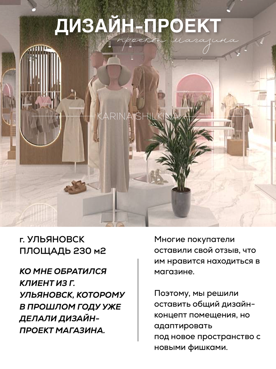 Это уже второй по счету дизайн-проект для клиента. Основная цель - создать дизайн в таком же стиле, только для нового помещения в центре города и адаптировать новые фишки под пространство. Самое впечатляющее, что встречает покупателя - это входная зона, которая создаёт эффект «вау» и не даёт покупателю сразу покинуть магазин, а наоборот, задержаться в нем подольше. Продумали все: идеальный маршрут покупателя, мобильность оборудования и создали динамику на стен, чтобы показать разноплановость развесок! За счёт этого повысится лояльность покупателя к магазину, а также увеличится средний чек! В магазине всегда высокий трафик, поэтому мы сделали целых 10 примерочных, и заранее продумали комфорт для каждого гостя магазина. А пока идёт ремонт, но уже не терпится увидеть открытие! Я уверена, что жители г. Ульяновск будут в восторге от нового пространства! Поделитесь своим впечатлением!🤗