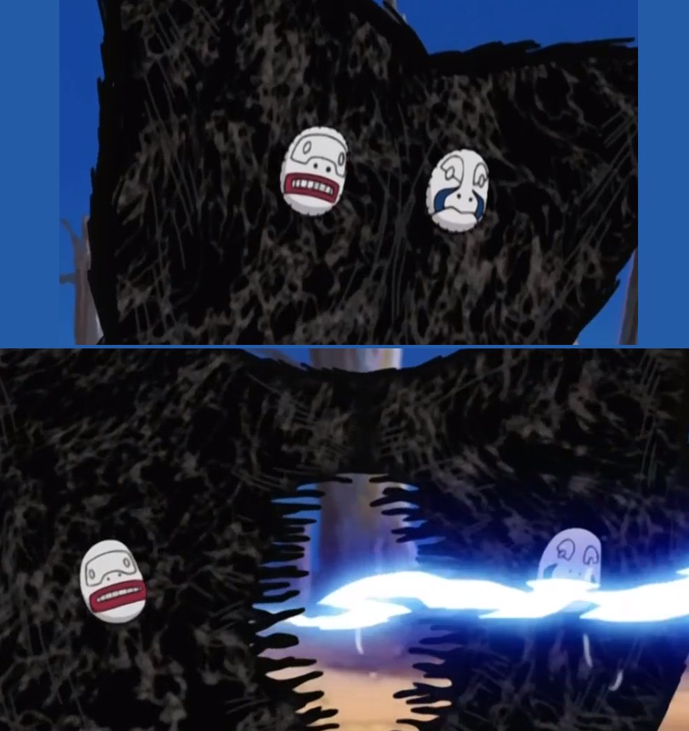 Какузу, понимая, что хоть его маски и обладают мощными стихийными дзюцу, но "шиноби, скопировавший 1000 техник" наверняка найдёт в своем арсенале что-то, дабы эти техники, как минимум аннигилировать друг об друга(как и произошло с двойным Райкири), поэтому в дело вступает следующая "стадия босса", и мы узнаем про новое свойство масок-сердец: они умеют объединяться и комбинировать свои атаки! При этом оставаясь довольно гибкими и эластичными для любой манипуляции со своей структурой(как момент на картинке ниже, с уклонением от дружественной молнии).