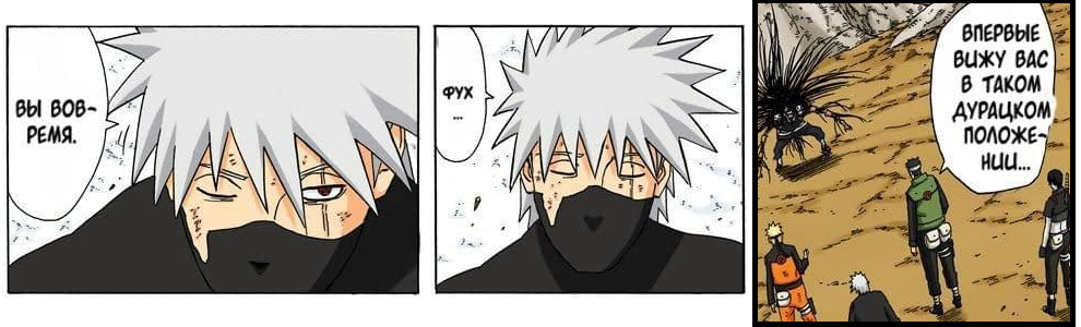 Фраза Какаши "фух, вы вовремя" может иметь дополнительный смысл, помимо облегчения, это может означать, как я и предполагал в предыдущей серии, что Какаши ещё чуть-чуть и использовал бы Мангекьё, с критическими для себя последствиями, но... ВОВРЕМЯ.