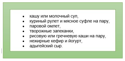 - Основа рациона – это белковая и растительная пища, приготовленная на пару или запеченная.