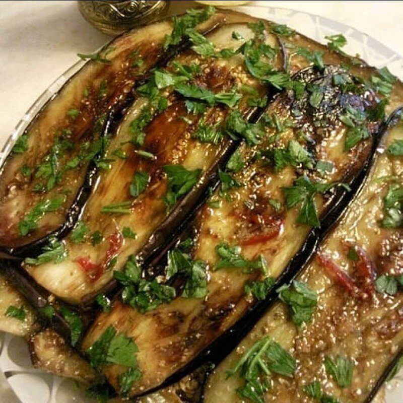 Ингредиенты: 🍅6-8 штук средних баклажана 🍅сок и цедра одного лимона 🍅3-4 зубчиков чеснока 🍅три ложки растительного масла 🍅три ложки меда 🍅половинка перца чили или сладкий соус чили 🍅столовая ложка молотого кориандра Приготовление: 🥗Баклажаны режем пластинками, делаем насечки крест-накрест, солим, жарим. Кладем на бумажное полотенце, чтобы убрать лишнее масло 🥗В миске разогреваем растительное масло, кладем туда срезанную цедру лимона и нарезанный чеснок. Прогреваем до прозрачности, минут 5. Не зажариваем! 🥗Убираем всё из масла, кладем туда мед, сок лимона. Опять прогреваем минуты 3, потом туда же порезанный чили и кориандр. Пусть закипит и на маленьком огне протомится немного 🥗Баклажаны выкладываем послойно, проливая нашей ароматной карамелью. Даем настояться и украсив зеленью, на стол! 🌺Приятного аппетита!🌺