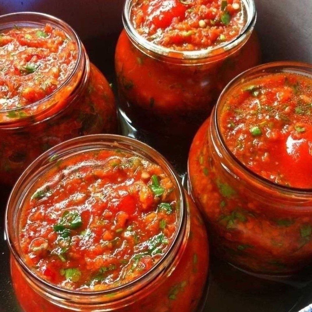 📝Нужно: 2кг помидоров , 4 морковки средних, 5 штук перца болгарских, 100 грамм масла раст, 100 гр уксуса 9%, 100 гр чеснока, горький перец 1 шт, 2ст ложки соли, 100 гр сахара, зелень петрушки и укропа мелко порезать . ⠀ 👩🏻🍳Приготовление: Все помыть, помидоры, если сливки на 2 части разрезать, если крупные на дольки, желательно не переспевшие, остальное все на мясорубке. Помидоры слоями в баночку и засыпать этими перекрученными овощами и так всю баночку, чередуя слои, затем в кастрюльку и стерилизовать 20-25 минут с момента закипания . Закатать , укутать. Приятного аппетита! И благодарю за лайки ❤️