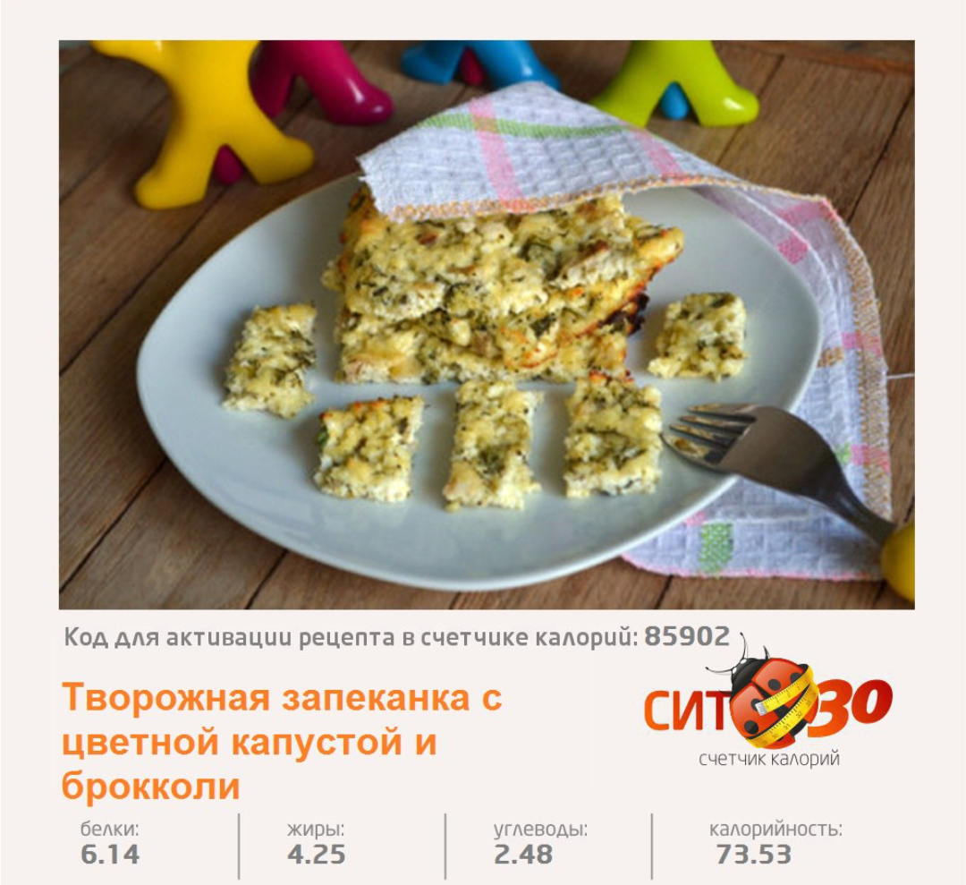 Ингредиенты: - творог 5% - 100 г - цветная капуста 100 - брокколи 100 г - вода 150 мл - яйца 2 шт - сливочное масло – 1 ч. л. Рецепт Мороженную цветную капусту и брокколи варим в течение 5 минут. Мелко шинкуем охлажденные сваренные овощи. К ним добавляем творог, яйца и хорошо все перемешиваем. Огнеупорную форму смазываем маслом и выкладываем в нее смесь. Запекаем запеканку 20 минут, при температуре 180 градусов. Если готовите в мультиварке, выбирайте режим «Выпечка», время на таймере 15 минут. Вынимаем, даем остыть и нарезаем.