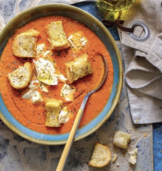Универсальный суп, который хорош и в горячем варианте, и в холодном. Нам понадобятся: 🍅 1,5 килограмма сочных помидоров; 🍅 300 граммов моцареллы; 🍅 5-6 зубчиков чеснока; 🍅 полпучка базилика; 🍅 6 ломтиков белого хлеба; 🍅 оливковое масло; 🍅 сушеный орегано; 🍅 молотая сладкая паприка; 🍅 соль и черный молотый перец. Чеснок очистим. Помидоры нарежем на четвертинки. Противень застелем пекарской бумагой и выложим дольки помидоров и чеснок. Посолим и поперчим. Посыпем паприкой и орегано. Польем оливковым маслом. Запекать будем в разогретой до 180 градусов духовке 45 минут. Для кростини хлеб нарежем на небольшие кусочки. Посыпем орегано и сбрызнем оливковым маслом. Запечем до хруста на решетке. 200 граммов моцареллы нарежем на небольшие кусочки. У базилика оборвем листочки. Запеченые помидоры и чеснок переложим в блендер. Добавим кусочки моцареллы и листочки базилика. Измельчим все в пюре. Если получится очень густое, то разбавим томатным соком. Если вы хотите горячий суп, то подог