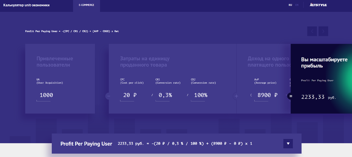 Удобный калькулятор Unit-экономики на одном продукте.