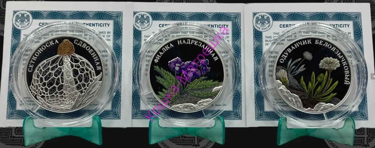 Инвестиция на будущее или монеты, которые могут выстрелить в цене по типу мультиков. Нумизматические новинки! Хотел было написать пост, но вся информация не поместилась, поэтому статья! Почему я считаю, что эти монеты могут стать дорогими в ближайшем будущем? Не инвестиционная рекомендация к действия. Друзья, 19 июля этого года Банк России выпустил, по факту впервые, серебряные монеты номиналом 2 рубля с цветной печатью в серии Красная книга. А именно, монеты: Фиалка надрезанная. Сетконоска сдвоенная. Одуванчик белоязычковый Все три монеты продаются комплектами у дилеров в среднем по 9 500 - 10 000 рублей, что получается не очень бюджетно, учитывая размер и вес монет, а я напомню Серебро 925 пробы, массой в чистоте по 15,55 или общий вес 17 грамм. И все-же, я думаю - есть шанс, что эти монеты могут выстрелить по цене и прилично, как минимум могут попытаться догнать нашумевшие мультики 3Р унция в цвете, которые выпускаются и по сей день, но сильно возросли в цене именно первые монеты.
