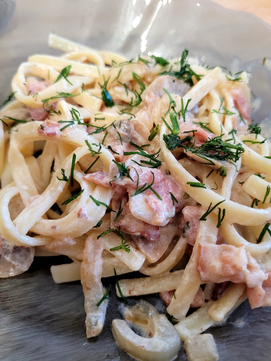 Эта паста любовная любовь, по-другому её не назовёшь 🤤🥰 Кстати, готовится она очень быстро – ≈ за 25 минут. Есть несколько хитростей, которые я использую: 1. Начинаю одновременно готовить тальятелле и соус (поставила воду, и приступила к соусу) 2. Я обычно кипячу воду в чайнике, а кастрюлю с небольшим количеством воды ставлю на плиту, чтобы она была разогрета к моменту закипания воды в чайнике. Потом доливаю кипяток в кастрюлю и вуа-ля, вода уже кипит :) Мне так удобно и в моем случае это сокращает время готовки✌🏻 Теперь погнали готовить ☺️ Ингредиенты: • Тальятелле 110-165 гр • Шампиньоны ≈150гр (4 средних грибочка) • Бекон сыро-копченный 150 гр (или можно взять 75 гр бекона, и 75 гр ветчины, я делала так. А еще можно не взвешивать и брать "на глаз") • Сливки 150-200мл • Сливочное масло для жарки • Растительное масло для жарки • Лук 1 средняя луковица • Орегано по вкусу • Соль, перец Приготовление: 1. Ставим воду на плиту, либо можете повторить мой способ. Если вы хоти
