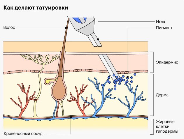 Когда человеку делают татуировку, тату-мастер прокалывает эпидермис и вводит иглу с краской в дерму. Этот кожный слой не слущивается, а частицы краски обычно слишком крупные, чтобы лимфатическая система могла удалить их из дермы и вывести из организма. Поэтому, если краска со временем не выцветет, вытатуированный рисунок сохранится на коже на всю жизнь.