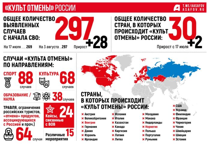 Интенсивность применения «отмены» России не снижается. За период 17 июля — 3 августа число выявленных случаев увеличилось на 28 — до 297 в общей статистике. Снова увеличилось число стран, пытающихся «отменить» Россию. В список добавились Венгрия и Норвегия. Теперь таких недружественных государств 30. Новые случаи «отмены» коснулись различных областей, включая спорт: 📍 Исполком Международной федерации настольного тенниса (ITTF) не допустил российских и белорусских игроков до участия в командном чемпионате мира в Китае. Визы, туризм: 📍 Эстония прекратила выдавать россиянам учебные визы и временный вид на жительство. 📍 Российские туристы в Финляндии столкнулись с ограничениями на провоз наличных денег, ограничений на бензин и провоз товаров дороже 300 евро. Образование: 📍 Студентка из России не смогла перевестись в магистратуру в университет Западного Лондона. В электронном письме ей отказали в переводе по причине «ответа на недавние события и ситуацию на Украине». Также «отмена» косн