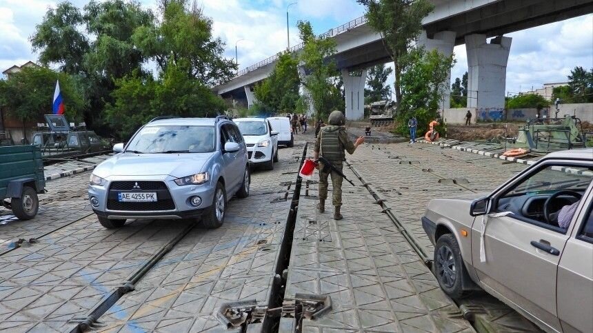 Украинские боевики упорно пытались уничтожить стратегический объект Херсона и лишить местных жителей короткой дороги. Фото: Стрингер / ТАСС; 5-tv.ru В Херсоне начался ремонт Антоновского моста, который разбомбили боевики. Восстановлением стратегического объекта занимается компания, которая строила Крымский мост. А пока сообщение с большой землей осуществляется через паромную переправу, которую организовали российские инженерные войска. Иван Литомин увидел, как все работает. Эту переправу здесь уже называют «дорогой жизни». С одного берега Днепра на другой едут легковушки и грузовики — везут продукты и лекарства. После того как украинские военные несколько раз ударили по Антоновскому мосту американскими ракетами, короткий путь, соединяющий Херсон с большой землей, оказался отрезан. Вместимость паромной переправы — до 30 машин. Сейчас здесь 26. Конечно, время ожидания в очереди — несколько часов. Но с сегодняшнего дня количество таких паромов увеличилось ровно в два раза. Вот на том бере