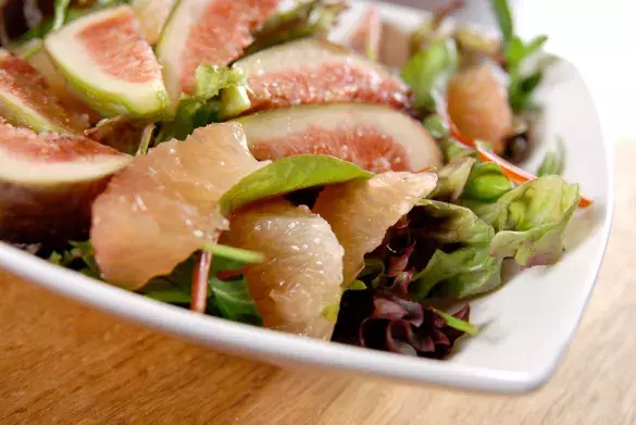 - Выложить в высокую салатницу зелень, сверху сделать фруктовую «подушку» из долек грейпфрута.