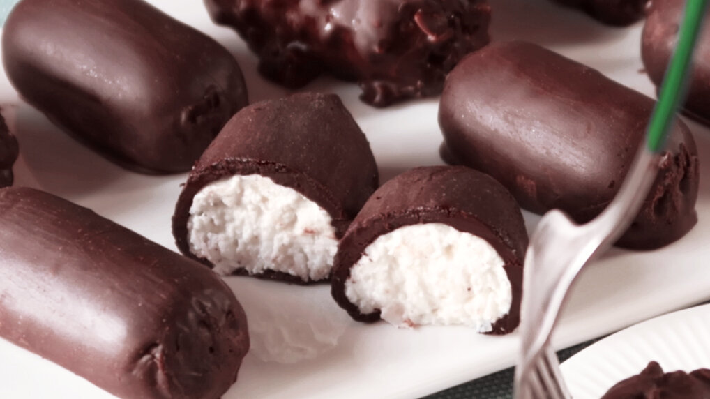 Привет, друзья. Сегодня готовлю творожные сырки. В творог я добавила кокосовую стружку и покрыла сверху шоколадной глазурью. Глазури два вида: просто шоколадная и шоколадная с орешками! Способ приготовления: Добавляю в творог сливочное масло. Творог может быть любой жирности. Высыпаю сахарную пудру и ванилин или ванильный сахар. Измельчаю продукты блендером В полученную массу добавляю кокосовую стружку. Можно приготовить сырки без кокоса Перемешиваю и перекладываю творожную массу в кондитерский мешок Отрезаю уголок ~3см и отсаживаю сырки на пищевую пленку. Можно использовать рулон пакетов Разрезаю пленку на прямоугольники Заворачиваю заготовки в пленку Закручиваю у пленки концы Убираю заготовки в морозильную камеру на 2-3 часа. Творожная масса должна замерзнуть Достаю заготовки, разворачиваю и готовлю глазурь Вариант шоколадной глазури с орехами. Растапливаю шоколад на водяной бане или в микроволновке короткими импульсами по 2-3 секунды. Добавляю растительное масло без запаха и измель