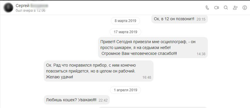 Взял я и запостил в этой группе историю о том как меня облапошили. Среди участников обсуждения три человека изъявили желание подарить мне осциллограф, Первым был Сергей, фамилию не пишу ибо разрешения не спрашивал.