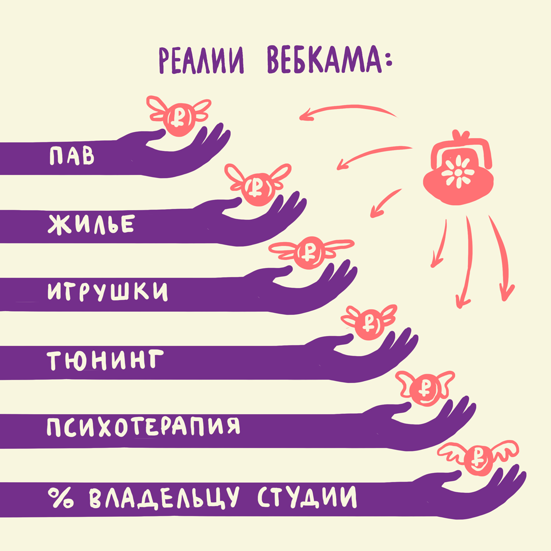 — «Очень много моделей левачили просто… Списывались лично, и эти чуваки им пересылали деньги, тоже в обмен на какие-то услуги. Некоторые даже с ними встречались. Для меня было бы дико с ними видеться… меня стремала вообще перспектива с ними еще и лично переписываться».