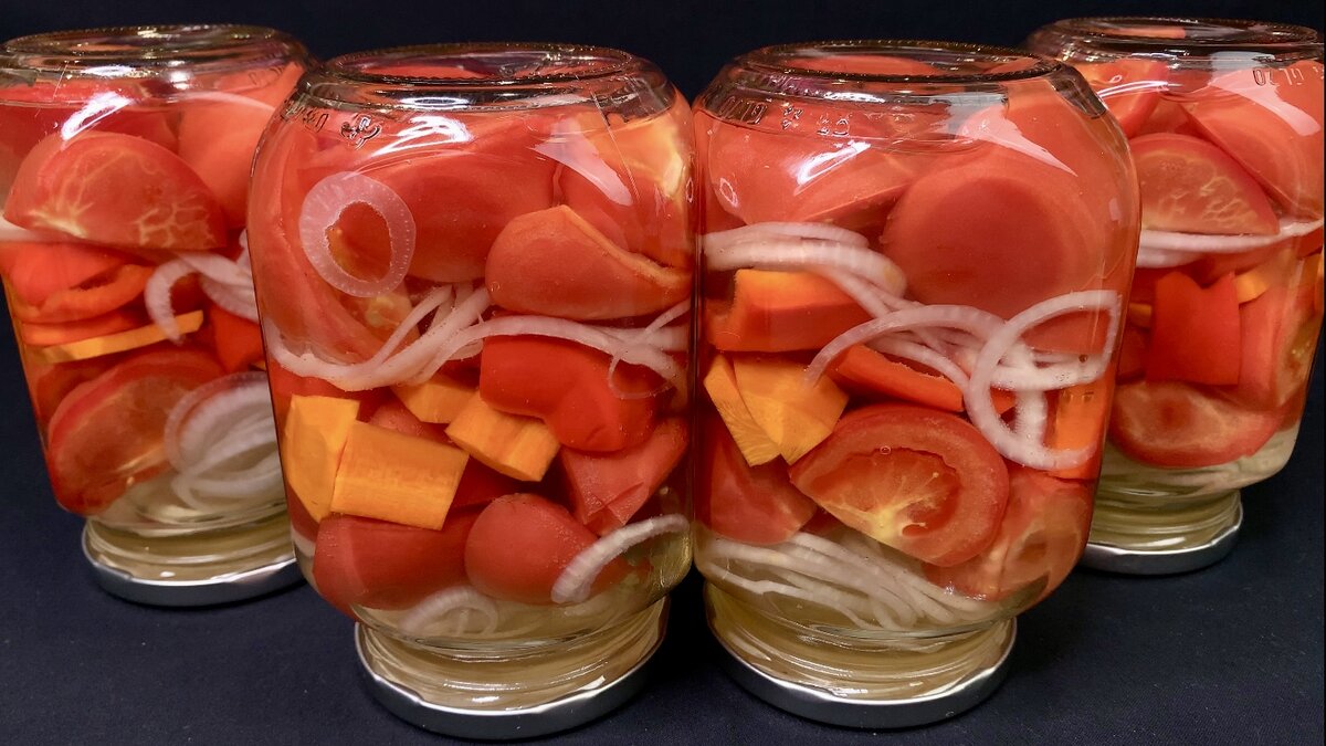 1. В чистую банку укладываем дольки помидоров, немного лука колечками, крупно нарезанный болгарский перец и кружочки моркови. Укладываем все овощи в два слоя. 2. В кастрюлю с водой всыпаем сахар, соль, ставим на огонь, мешаем до полного растворения, затем добавляем лавровый лист, чёрный перец горошком, доводим до кипения, варим