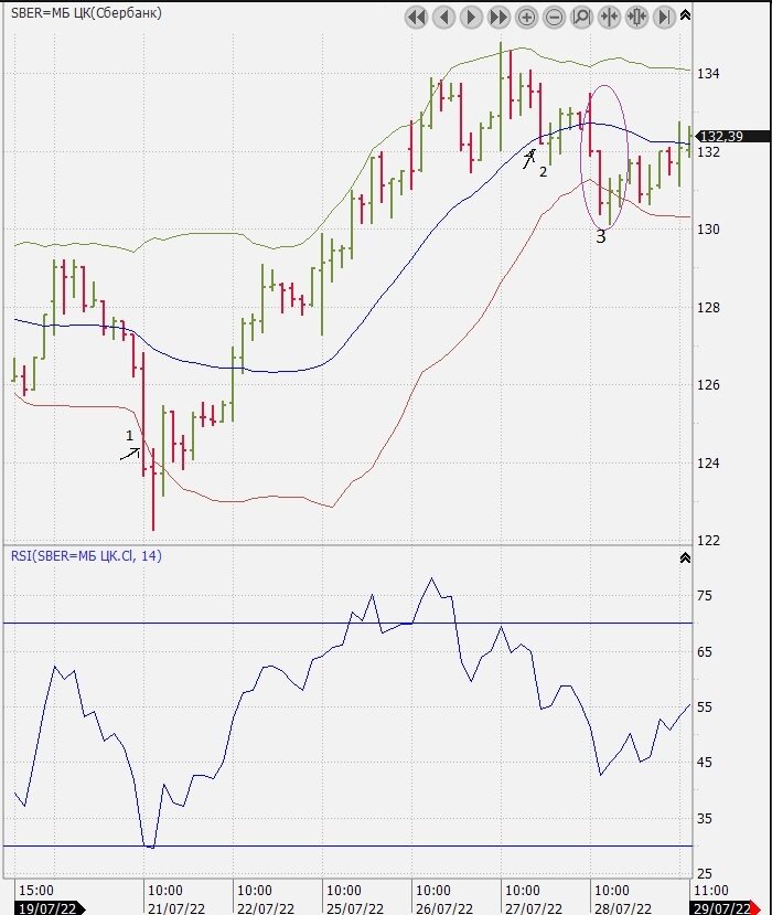 Стрелка №1 на графике показывает момент, где сначала свеча касается линии поддержки (закрытие свечи внутри канала), следующая свеча выходит из канала (закрытие ниже линии поддержки). При этом индикатор RSI чуть ниже значения 30. Это явный сигнал на открытие позиции. Далее цена растет, несколько раз касается линии Сопротивления, что говорит о сохранении тренда, RSI становится больше 70 (что говорит о перепроданности). Вот тут есть дилемма, или закрывать позицию про пересечении RSI уровня 70 сверху вниз, или дождаться пересечения линии Боллинджера средней линии (стрелка 2) и тогда закрыть сделку.