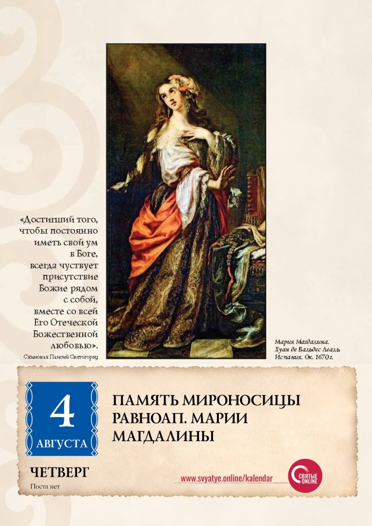 На берегу Геннисаретского озера, между городами Капернаумом и Тивериадой, располагался небольшой город Магдала, остатки которого уцелели до наших дней. Ныне на его месте расположено подворье Русской Духовной Миссии в Иерусалиме. В Магдале когда-то родилась и выросла женщина, имя которой навеки вошло в евангельскую историю. В Евангелии говорится, что Господь изгнал из Марии семь бесов. С момента исцеления она начала новую жизнь – стала верной ученицей Спасителя. Вместе с Божией Матерью и другими женщинами она с великой скорбью пребывала у подножия Креста Господнего. Евангелисты перечисляют среди стоявших у Креста еще и мать апостола Иакова Меньшего, и Саломию, и других женщин, но все называют первой Марию Магдалину. Это говорит о том, насколько выделялась она из среды всех женщин, окружавших Спасителя. На ее глазах Иосиф с Никодимом внесли в гробницу Его бездыханное тело. Верная закону, в котором была воспитана, Мария вместе с другими женщинами пребыла весь последующий день в покое. Но