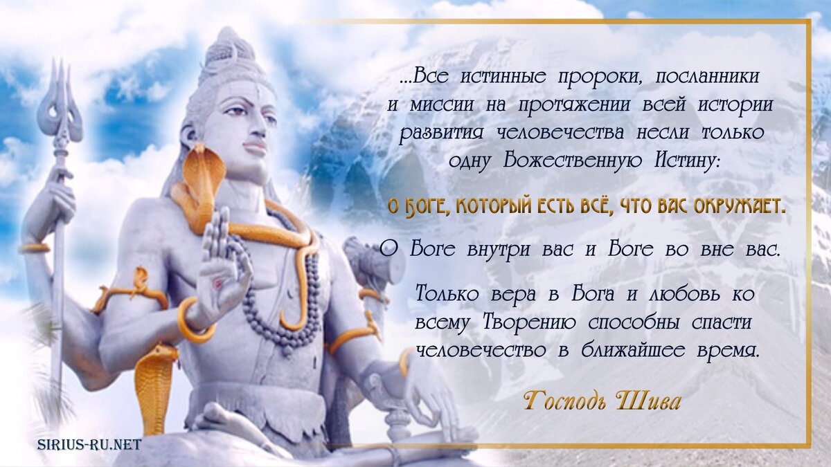 Осторожно: случайным негативом в мыслях и чувствах, рикошетом можно навредить себе, потому что: "Предупреждаю, что вы разговариваете с Богом. И поэтому вы должны делать это трепетно, с большим благоговением в сердце. Все ваше существо должно быть настроено на общение с Богом." Возлюбленный Бабаджи, 5 декабря 2009 года. Счастьем для такой страны, как Россия, будет создание правильного отношения к Богу, к нравственному воспитанию. Россия – страна, любимая Богом. И будущее России связано с восстановлением традиций истинной веры. Веры, основанной не на внешнем почитании Божества, а на внутреннем почитании Бога, находящегося в каждом человеке. Воспитание подрастающего поколения в традициях поклонения Божеству, пребывающему в каждом человеке, в уважении к старшему поколению является первоочередной задачей. Любой внешний образ Божества необходим только как напоминание вам самим о вашей Божественной природе и Божественной природе всех окружающих вас людей. Почитание Божества не имеет ничего