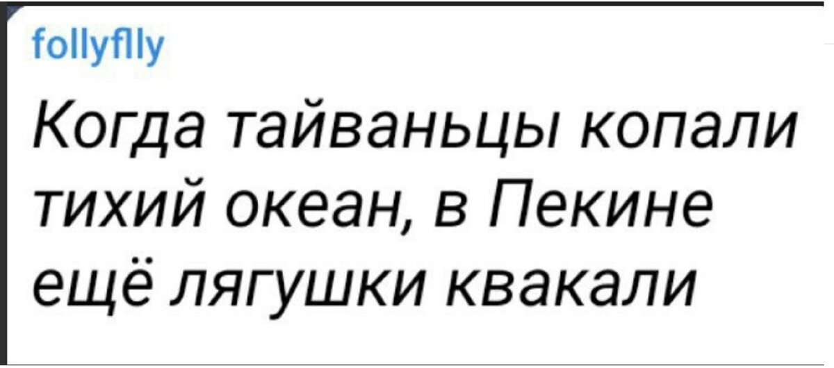 А вы заметили, как тема Тайваня мгновенно практически начисто исчезла из новостных сводок? Вчера почморили-почморили китайцев, а сегодня уже вообще никому не интересно, что там происходит. Поскольку запаслись поп-корном и ждали зрелищ. Бывшие вирусологи, мгновенно перековавшиеся в военных стратегов и укроведов, уже готовы были стать тайвановедами... но не срослось. И пришлось расходиться по домам. А вообще, вчера много интересного в социальных сетях было. Конечно же, всю ситуацию сравнивали с тем, что происходило и происходит на территории Украины. И стёб был вполне достойным. Вот ещё: "Тайваньцы считают, что именно они настоящие китайцы, а те китайцы, которые живут на территории КНР - потомки татар и финнов, поэтому не могут освоить высокие технологии, доступные жителям Тайваня". Вот прям в точку. Самое интересное, что украинцы, конечно же, поддерживают в этой ситуации Штаты, ни разу не задумываясь, что как раз жители мятежного островка - и есть те самые пресловутые СЕПАРЫ, над котор