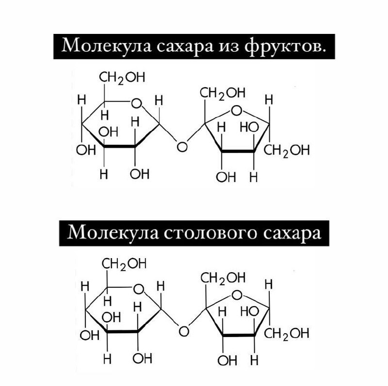 «Я не кушаю сахар вообще, только фрукты и мёд» (с). Такие утверждения я слышу постоянно от разных людей, которые максимально, зачастую и фанатично, пытаются защитить себя от вреда сахара. И при этом они заменяют его фруктами и/или мёдом. 👨🏼🎓Хочу кое-что разъяснить. На картинке ниже👇🏻 вы можете увидеть строение сахара, две молекулы: молекула сахара из фруктов и молекула столового сахара. Как вы уже поняли, они абсолютно идентичны! Сахароза - это дисахарид, состоящий из 1й молекулы глюкозы и 1й молекулы фруктозы. 🍎 В фруктах и мёде находится тот же сахар, что и в упаковках с магазина. Это, как вода набранная из источника и купленная в бутылке. Состав тот же - H2O. Такая же история и с сахаром. ⚠️Ваш организм не понимает вашего намерения «оздоровиться»! Ваш организм не различает с каких источников он получает глюкозу: конфета🍬 или яблоко🍏 . Демонизируете сахар только ВЫ!!! Наделяете его негативными качествами тоже ВЫ!!! ‼️ Вред от сахара = его количество. Если вы скушаете 500