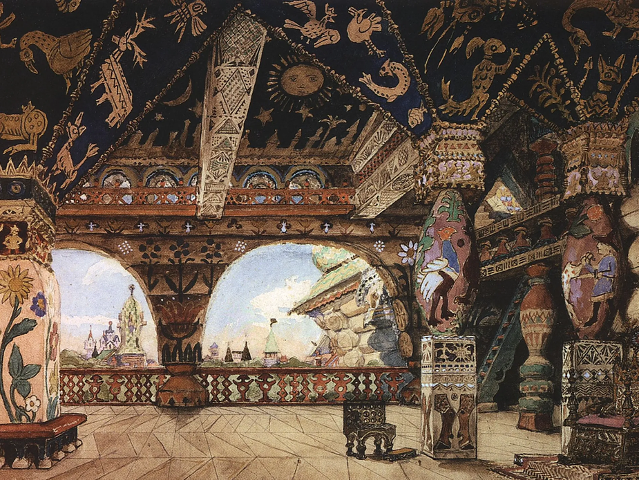 Художник Виктор Васнецов вдохновлялся древнерусским зодчеством и народными ремеслами и создал удивительные по красоте и точности декорации для «Снегурочки» Александра Островского. Критик Владимир Стасов писал: «Васнецов сочинил все костюмы и декорации — в том числе «Палату Берендееву». Это — истинные chef-d’oeuvre (шедевры) театрально-национального творчества. <…> Никогда еще ничья фантазия, сколько я способен судить, не заходила так далеко и так глубоко в воссоздании архитектурных форм и орнаментистики Древней Руси, сказочной, легендарной, былинной. Все, что осталось у нас в отрывках бытовых от древней русской жизни, в вышивках, лубочных рисунках, пряниках, деревянной древней резьбе, — все это соединилось здесь в чудную, несравненную картину. Для любования и изучения не только художников, но и всех развертываются здесь широкие, далекие горизонты».