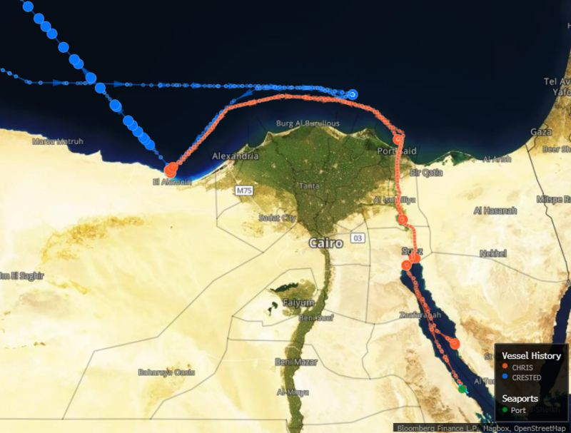 Какая неожиданность. Хотя как сказать. С учётом топливных трудностей в Европе, эта нефть вполне может пойти через Египет и на европейский континент. Как сообщает Bloomberg, Россия, похоже, нашла новый способ доставить свою нефть на мировой рынок. Рано утром 24 июля груз объемом около 700 000 баррелей российской нефти был доставлен в египетский нефтяной терминал Эль-Хамра на средиземноморском побережье. Через несколько часов другое судно забрало партию нефти из этого порта, которая могла включать часть нефти, поставленной из России, или вообще состоять только из российского "черного золота". Необычный шаг в поставках нефти затрудняет отслеживание конечного пункта назначения груза, таким образом поставки российской нефти становятся всё скрытней. Нефтяной терминал Эль-Хамра, управляемый египетской компанией Western Desert Operating Petroleum Co., имеет шесть резервуаров для хранения, способных вместить 1,5 млн баррелей сырой нефти, и один буй-швартовщик для погрузки и разгрузки. Терминал