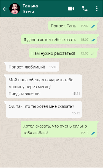 Привет, дорогой друг! У каждого из нас в жизни случались казусные ситуации. Вот, сделаешь что-нибудь, а потом жалеешь об этом! Но! Сегодня пойдёт речь о тех случаях, когда удача была на твоей стороне и неприятной истории не случилось. Такое тоже было у каждого. Подобное везение может произойти где угодно. В том числе и в переписке. А поэтому, я представляю твоему вниманию: Топ 5 моментов в переписке "Фух не отправилось!" Отношения - это не только любовь и счастье, но порой и расставания. Конечно, лучше расставить все точки над "i" при личной встрече, но кто-то считает иначе. Перед вами переписка парня, который хотел расстаться с девушкой, но в итоге передумал. Ещё одна переписка, связанная с отношениями. В этот раз всё куда более радужно. Хоть, и есть неловкий момент, но всё обошлось) Смотреть футбол - дело интересное. Смотреть футбол, делая ставки - ещё интереснее! Следующая история как раз про это. Дарить подарки - это, конечно, хорошо. Но кто бы что не говорил, а получать подарки