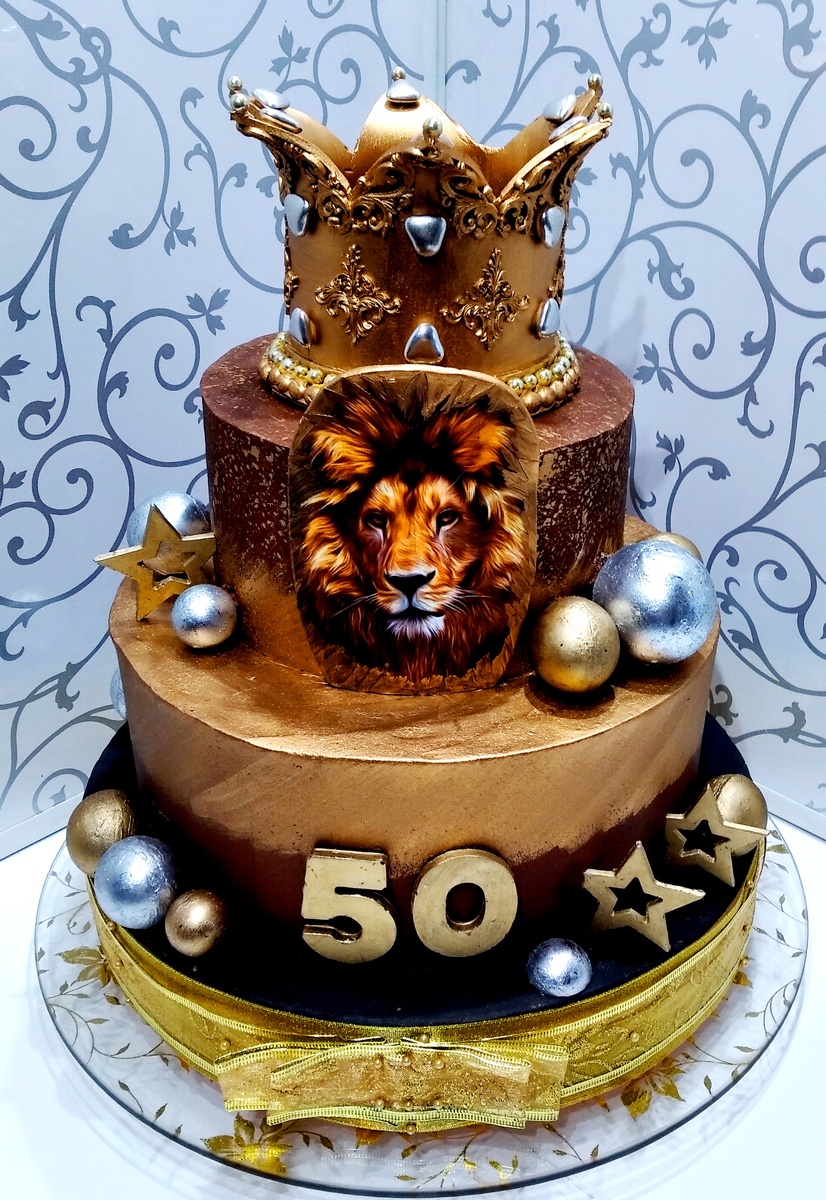 В моей копилочке не один торт на тему "Лев". Бывали без изображения этого зверя, бывали и с изображением. Вес этого торта - 6 кг. Диаметры ярусов 26/18 см. Общая высота - 38 см. Высота самого торта без декорации 20 см. Состав: В оформлении использовала кандурин, фигурки из шоколада, мастику,сахарную печать. Сочетание шоколада и вишни - самое, на мой взгляд, гармоничное. Такой торт точно не оставит ни одного равнодушного гостя.
