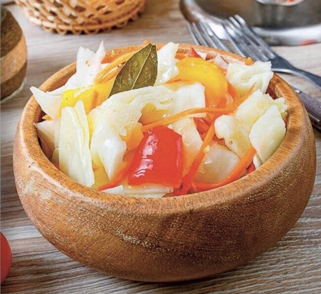 Вкусная хрустящая капуста готовится за один день. Сладкий болгарский перец добавляет вкус и аромат. Нам понадобятся: 🥬 2 килограмма белокочанной капусты; 🥬 4 средние моркови; 🥬 2 сладких болгарских перца, желтый и красный; 🥬 5-6 зубчиков чеснока; 🥬 чайная ложка молотого кориандра; 🥬 половина чайной ложки молотого острого красного перца. Для маринада: 🍃 750 мл воды; 🍃 75 граммов соли; 🍃 170 граммов сахара; 🍃 200 мл яблочного уксуса; 🍃 150 мл растительного масла; 🍃 10-12 горошин черного перца; 🍃 2 лавровых листа. Капусту сполоснуть. У перцев удалить плодоножку и семена. Нарезать капусту и перцы на небольшие кусочки. Морковь очистить и натереть на крупной терке или терке для моркови по-корейски. Чеснок очистить и нарезать тонкими пластинками. Сложить овощи в стеклянный пищевой контейнер. Добавить кориандр и жгучий перец. Хорошо перемешать. Вскипятим воду в кастрюле. Добавим соль и сахар. Перемешаем, чтобы они полностью растворились. Добавим горошины перца и лавровый лист. В