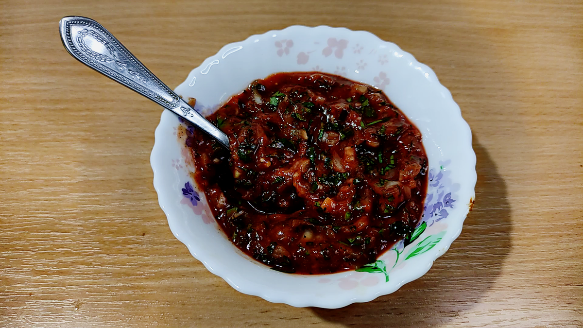 Не один шашлык не обходится без соуса, так зачем покупать в магазине соус или кетчуп для шашлыка или курице-гриль когда можно просто и быстро сделать его в домашних условиях. И нам понадобится минимум продуктов. Очень вкусный соус к шашлыку получается из "Краснодарского соуса", но если его нет под рукой, то можно заменить на вкусную томатную пасту, самое главное что бы Вам нравилась, ведь от этого будет зависеть вкус нашего соуса. Рецепт: Как можно мельче нарезаем лук, и проходимся ножом по нарезанному луку что бы он пустил сок, и выкладываем в тарелку. Мелко нарезаем петрушку, так же проходимся ножом чтобы петрушка дала не много сока и аромата, и выкладываем к луку, (можно добавить базилик, кинзу, это на Ваш вкус) В тарелку с луком и зеленью выдавливаем два зубчика чеснока. Добавляем Краснодарский соус или томатную пасту. Добавляем хмели сунели, черного перца по вкусу, соль, сахар, и одну чайную ложку 9% уксуса. Теперь надо все хорошо перемешать, ложечкой растираем чеснок, зелень,
